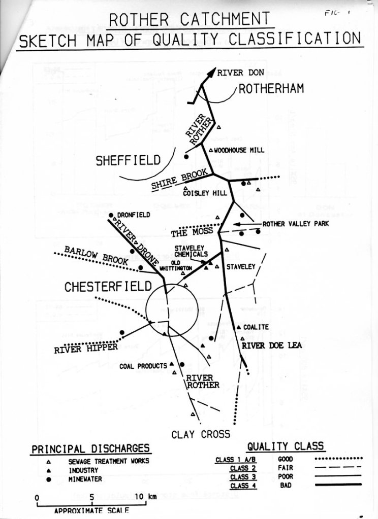 Literally just across from the Brimington parish boundary the author – Graham Coster – found discharges from the Old Whittington sewage treatment works were ‘a brown bubbling flow that curled away downstream in white flocks, an olive stain just under the surface.’ Here the sewage treatment works were then adding to the already poor state of the Rother, so much so that downstream from there the river changed into Class 4 – the worst level of polluted water course, according to the National Rivers Authority. The sewage work’s discharge outflows were fairly regularly breaching consents. Downstream there was the nearby (to Brimington) outflows from Staveley Chemicals to add to the pollution and there were more, as the Rother went on its way to join the river Don.