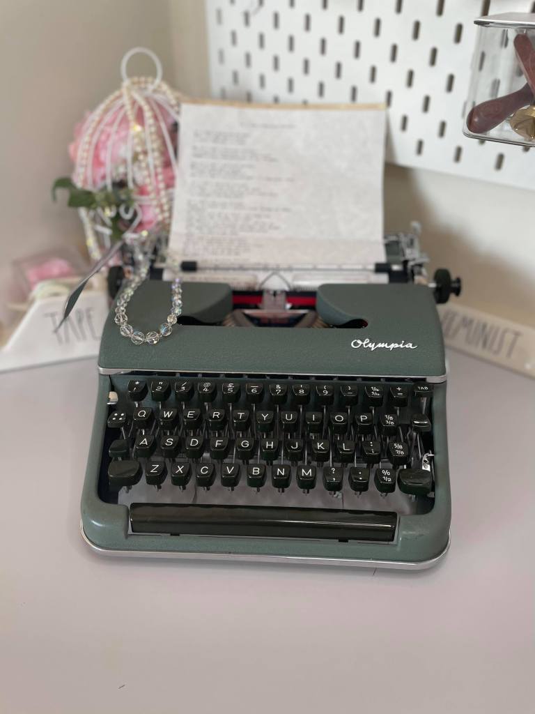 The typewriter belonged to Joan Cheesley. Many local residents will remember her. She lived on Manor Road, later Well Spring Close and did much work in the village, particularly with the Ashgate Hospice appeal. Joan is still alive and must have been somewhat surprised when a collector – Emma Simmonds – having purchased her Olympia typewriter contacted her.