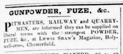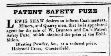 Lewis was a grocer at 22 Holywell Cross, Chesterfield. This was on the corner with the east side of Cavendish Street. You can see a Victorian photograph of the premises on Picture the Past. He advertised his grocery business very regularly in the Chesterfield newspapers. The first reference we’ve found to him as a grocer was in the Derbyshire Courier in December 1848. Before then, in February 1848, Lewis placed an advert for ‘Gunpowder, Fuze, etc,’ from ‘Lewis Shaw’s Magazine, Holywell Cross’. Then in 1852 he advertised that he was ‘agent for the sale of W. Brunton and Co.’s Patent Safety Fuze, which obtained the prize at the Exhibition’.
