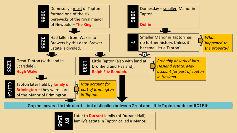 By 1233 the Manor had fallen to the Brewers. In 1233 Tapton was itself divided into Great Tapton and Little Tapton. Little Tapton passed as a small part of a portion also including Dronfield and Hasland to a Ralph fitz Ranulph. Little Tapton was probably absorbed into a much greater Hasland estate that Ralph Fitz Ranulph had. It may account for a detached portion of Tapton being in Hasland.