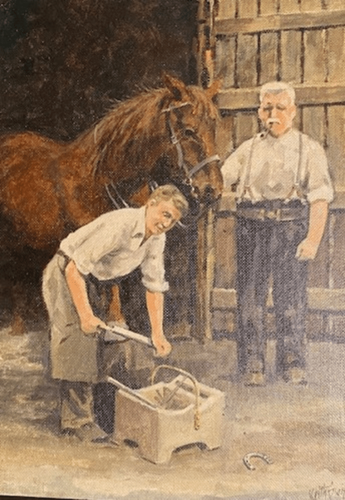 Back to the beginning? son Albert (left) and father Ernest (right) Rhodes are seen at work in their forge on Ringwood Road. For many years this painting by Keith Swift hung in the Three Horse Shoes public house near to the former house and forge of the Rhodes family on Ringwood Road. (Collection P Cousins).