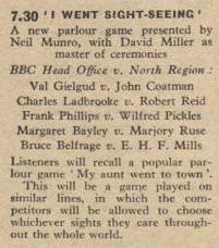 Occasionally he appeared in front of the microphone. Whilst Programme Executive at Bristol, the Western Daily Press reported that “Mr Mills, it may be said, announces fairly frequently from Bristol, and does it very well”. Whilst in post at Manchester, he even appeared in a half-hour light entertainment programme broadcast on Forces Radio in 1944. Called I went sight-seeing it took the form of a variant of the memory game My aunt went to town in which the competitors could choose any sights anywhere in the world. The contest was between a team representing BBC Head Office and the North Region. Apart from EHF Mills, the competitors were actors, radio presenters or radio announcers. The North Region team included Wilfred Pickles, who presented the popular BBC radio programme Have a go, which ran from 1946 to 1967, and which also featured his wife, Mabel.