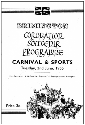 The Coronation festivities in Brimington centred around a planned carnival and sports day on the actual day of the Coronation – Tuesday 2 June – the front cover of the programme is illustrated above. A committee was formed to co-ordinate events. Carnival prizes were given for fancy dress; ‘decorated lorry, dray or tableaux,’ decorated cycles and prams ‘or any wheeled vehicle’ and others. There was also a window dressing competition. The sports programme was planned to commence with races from approximately 6 pm. The whole was to culminate in a firework display and lighting of the Coronation bonfire at 10.45 pm.