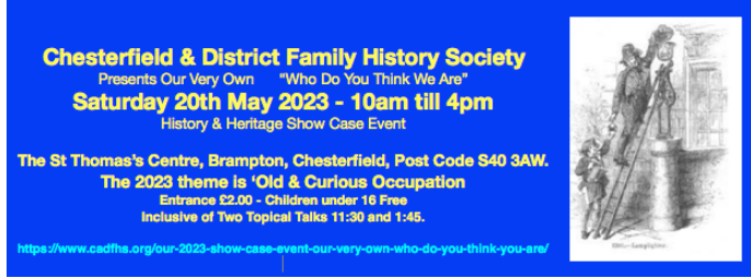 We’ll be having a stall at the fair arranged by Chesterfield and District Family History Society at St Thomas Church Centre on Saturday 20 May from 10am until 4pm. The centre is situated behind St Thomas parish church on Chatsworth Road, Brampton. Car parking is available nearby or on-street.