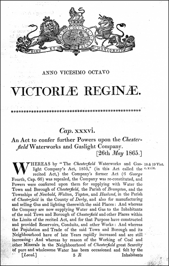 Another Act of Parliament in 1865 conferred further powers on the existing company. It authorised an extension of their water supply area into Brimington and Whittington.