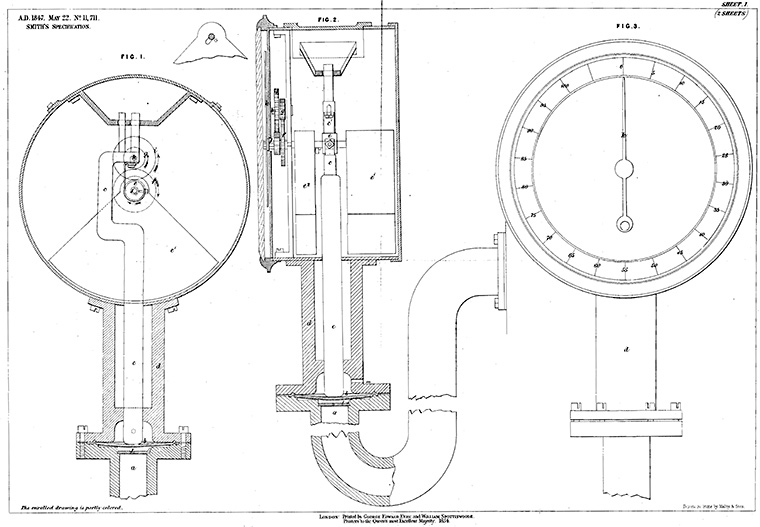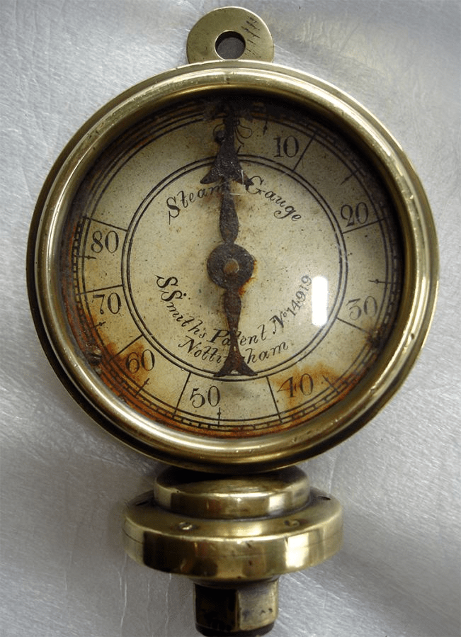 The inventor of this steam pressure gauge was, as described, Sydney Smith (1803-1884) who is said to have invented it when he was 44. Operating from a small foundry at Sneinton, Nottingham, in 1882 the company he then headed made a move to larger premises at Hyson Green, also in the same town (Nottingham was not granted city status until 1897). Although there are other claimants, Smith is now widely credited with its invention. He certainly was the first patentee – 2nd May 1847, Patent No. 11711.
