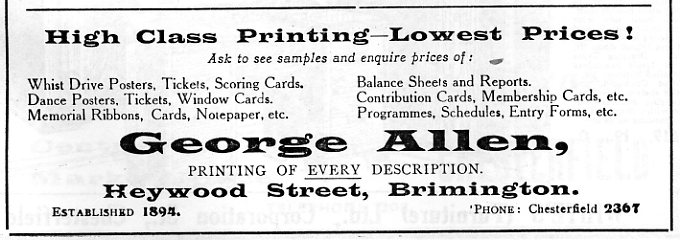 Heywood Street was home to the premises of printer George Allen, established in 1894. The company gained a national reputation as a printer of posters and other theatrical items. The premises are now occupied by housing. Another 19th century village printer was Ringrose. Allen possibly took on his business, but this needs further research.
