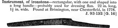 In 1778 workers improving Station Road discovered an ironstone instrument. They had found it in a nearby field that they were excavating for stone. The instrument was supposed, by Dr Pegge, to be a possible ‘fighting club of the Britons’, but it has also been described as used for dressing flax. It was 22-inches long, including a 2-inch handle, with a slight arc. The item made its way to Weston Park museum at Sheffield but has not survived.