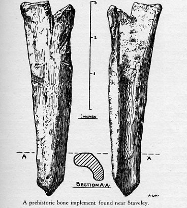 A prehistoric bone implement that Dr Arthur Court described in his ‘Staveley my native town’ book as ‘found on the road to Chesterfield…’, was more probably found in the Tinkersick area of Chesterfield Road, near the boundary with Tapton. This artefact was in Court’s possession but is now lost. It has also been described as a boring tool.
