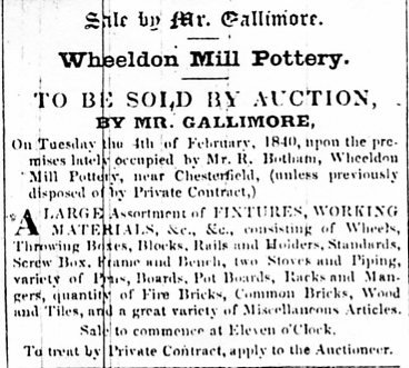 A pottery was briefly established at Wheeldon Mill, on the side of the canal, opposite the present Drake Terrace. It was first mentioned in 1824 when a buyer was sought for the business. After some changes in ownership, the stock and equipment were advertised for sale in 1840. The pottery produced brown ware and stoneware, including bottles. For further information see the article in Brimington and Tapton Miscellany 8; ‘A canalside pottery at Brimington’, by Philip Riden and Philip Cousins. The pot-house building has long-since disappeared.