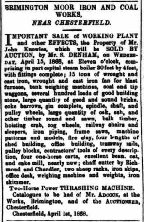 A single blast furnace on Brimington Common – the site of the present Furnace Farm – was operating sometime between 1850 (possibly earlier) and 1858, under a Matlock born railway contractor John Knowles (d. 1869), firstly in partnership with Chesterfield solicitor and town clerk John Cutts (the partnership between the two was dissolved in April 1856). Knowles also had a successful sanitary pottery and refractory business in Woodville, south Derbyshire. Industrial activity on the site appears to have continued for sometime after the single furnace was blown out. (The furnace was hot-blast not cold as previously supposed). The premises were also an operational farm. Henry Bradley‘s father worked as a book-keeper at these ironworks. Knowles also operated coal and ironstone mines. He latterly lived at Knowleston Place in Matlock after a period at Herne House, Calow. His work as a railway contractor also resulted in him travelling and living around the country.