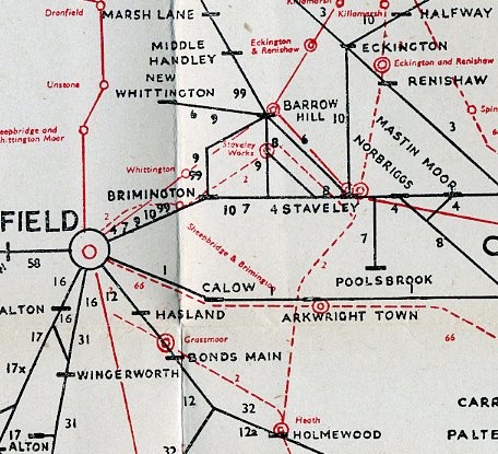 The Manchester, Sheffield & Lincolnshire Railway (later Great Central (GCR)) Chesterfield Loop, opened in 1892 between junctions with the main line at Heath and Staveley, lay mostly to the west of the Rother, but part of the goods yard at Chesterfield Central station and a short section of the line north of Lockoford Lane were in Tapton. The station, on Infirmary Road on the outskirts of Chesterfield town centre, was opened in 1892 and closed when the line was shut in 1963. Some years later the track bed was used as the route of the Chesterfield Inner Relief Road. There were sidings on the GCR which enabled some freight traffic to be sorted and some exchanged with the Midland Railway (whose ‘Canal Branch’ right up to Barlow also commenced here.) These sidings were slightly north of the canal lock-house and immediately abutted the canal towpath.